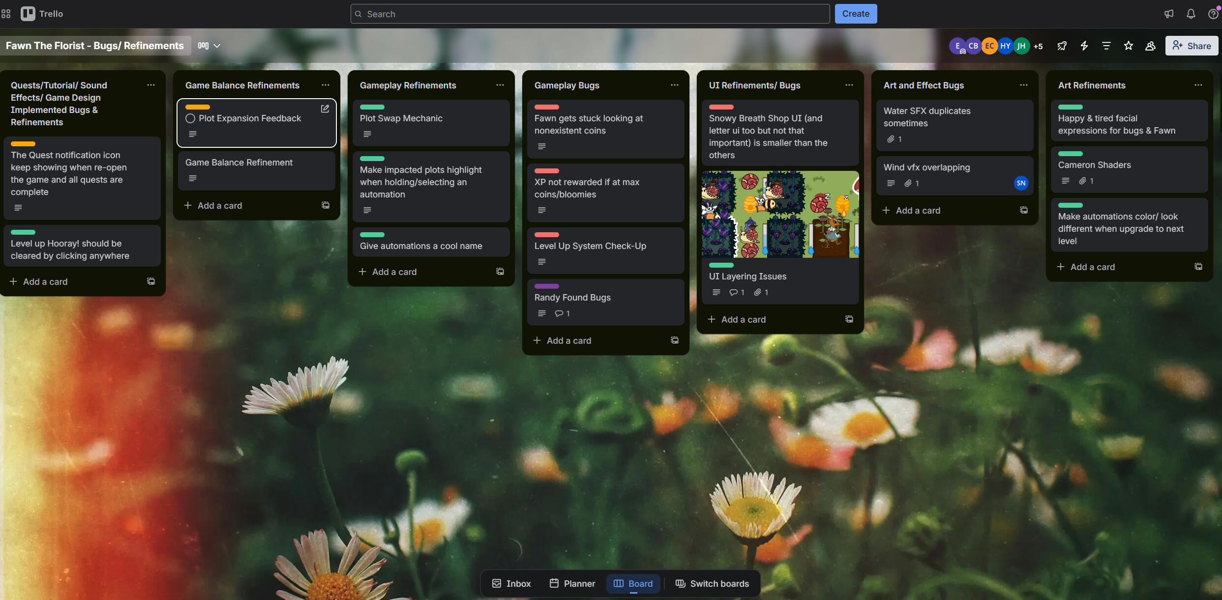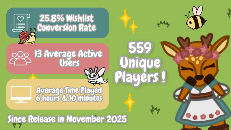 Fawn the Florist represents the culmination of my university development experience and the largest production I have led, spanning nine months across four disciplines and eleven team members.As producer, I established team workflows, clear responsibilities, strong communication flows and realistic milestones to maintain alignment across all disciplines. Establishing these quickly empowered discipline leads to make independent decisions allowing me to focus on cross-discipline coordination, early problem resolution, and maintaining production momentum.I ensured to build in flexibility within the project plan (for rest, sickness or setbacks) which helped prevent burnout, enabled consistent progress and allowed us to take advantage of opportunities such as Steam Next Fest, Mac support and showcasing our game at SuperNova.Alongside production, I led UI implementation working closely with artists and designers to create an aesthetic and functional interact within a limited screen space. I was able to build confidence in creating scalable interface systems that could easily be used by automation and planting mechanics and learnt UI animations and tweening for a more reactive UI experience for players. I also learnt how to use the Steam API features including achievements and analytics to add extra depth to the gameplay and allow the team to better track progression or use statistic for marketing.These efforts contributed to the team achieving a strong launch, reaching 559+ unique users, average playtime of 6 hours, 95% positive Steam reviews (Out of 26 reviews), and a 25.8% wishlist conversion rate within two months. This reception was beyond our expectations and heartwarming to see players giving feedback, requesting refinements, creating fanart or guides to help each other.