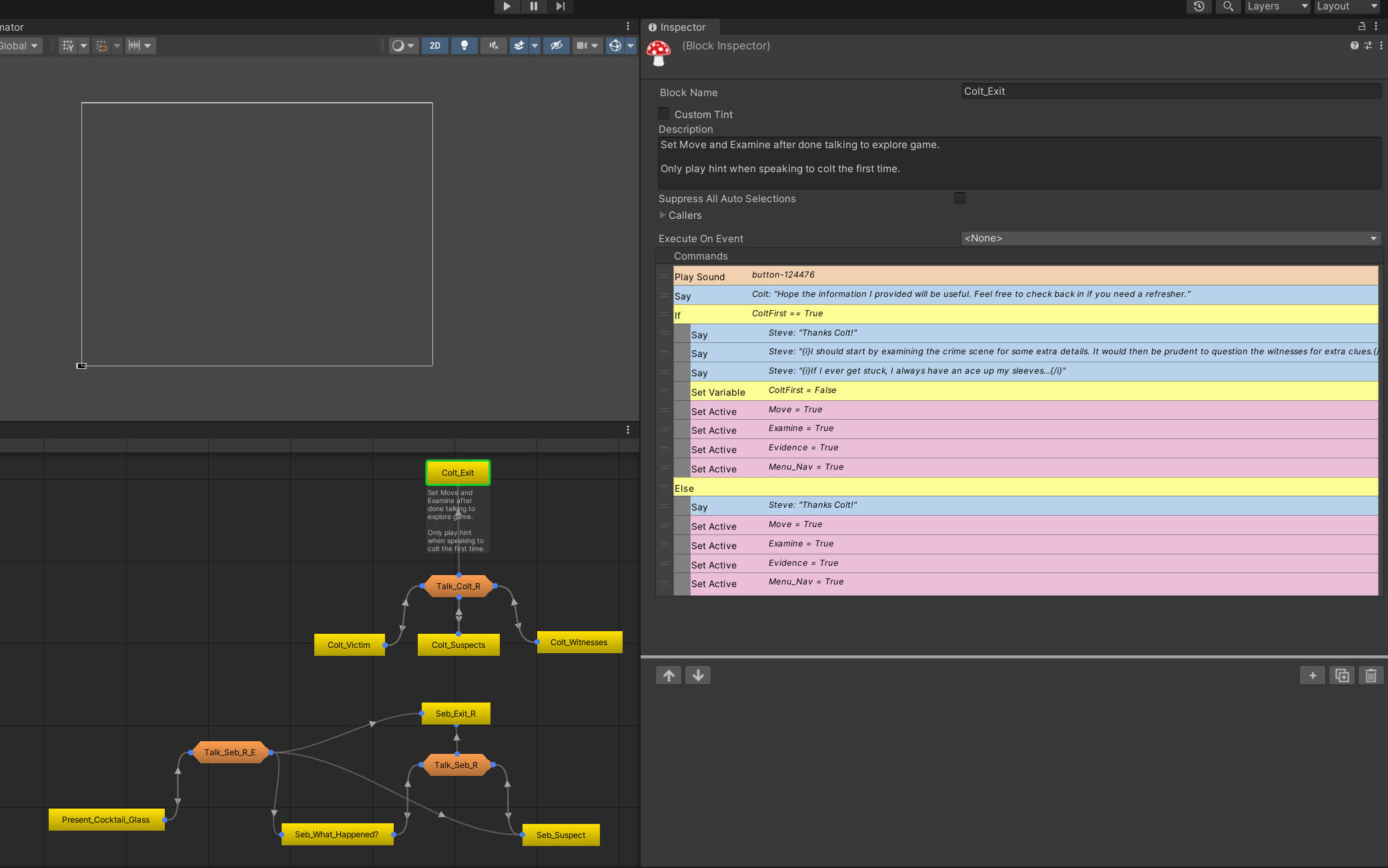 As the sole programmer with no prior visual novel experience, I chose to streamline development by using a plugin to handle core functionality. This allowed me to quickly prototype UI designs and give the artists clear guidance on required assets.We used Fungus, a free (though deprecated) Unity tool, which provided everything we needed. Its active Discord community helped me overcome knowledge gaps. Fungus uses blueprint-style block coding but can also be extended with scripts, allowing me to add custom functions beyond its built-in capabilities.Fungus was used to implement the text writer, multi-dialogue, scene transitions and Alethetia's Switch.